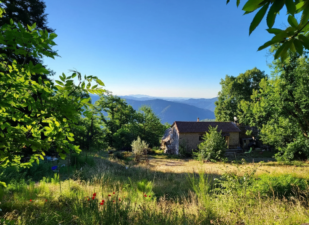 Situé au cœur du Parc national des Cévennes, ce mas entièrement rénové de 150 m² offre ce que le voyageur cherchait déjà au XIXᵉ siècle : le silence, l’espace et la sensation rare d’habiter pleinement le paysage. Orientée plein Est, la maison s’ouvre sur une vue panoramique saisissante ; chaque aube devient un spectacle intime, lorsque le soleil embrase les vallons et les châtaigniers.